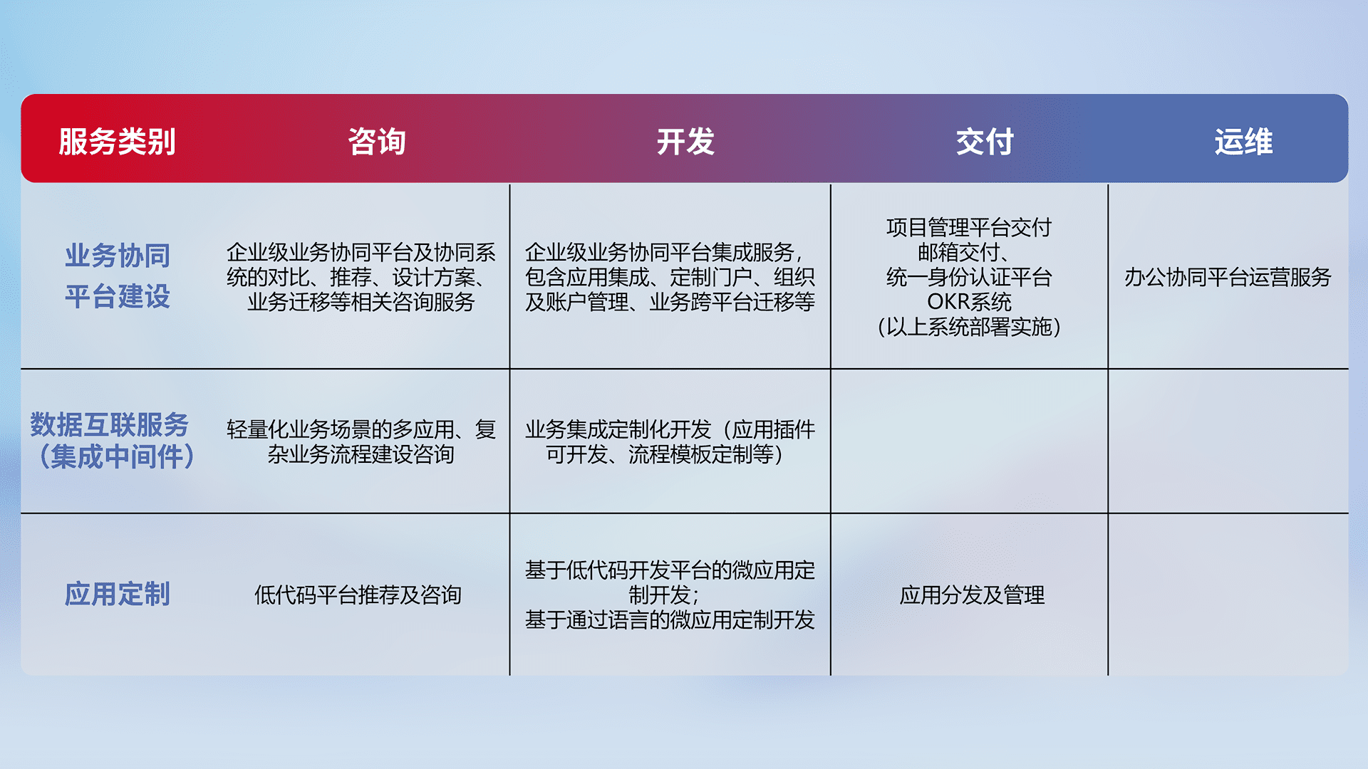 针对钉钉、、、企微、、IDaas等平台级产品提供产品的规划、、、方案、、交付、、、定制化开发等服务,,实现如统一协同办公、、、智能客户服务、、、混合会议管理、、、智能数据查询、、、等业务场景,,,,实现数字化转型。。。。